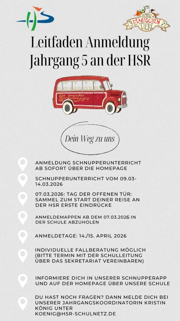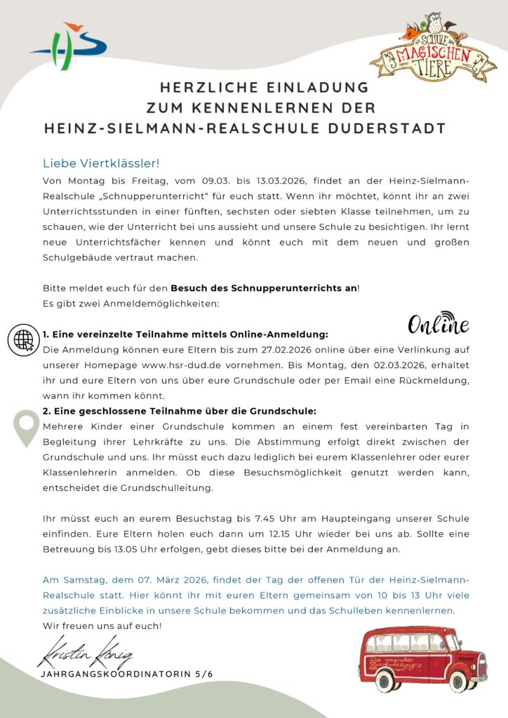 Herzlich Willkommen zu den Schnuppertagen an der HSR! Von Montag bis Freitag, vom 09.03. bis 13.03.2026, findet an der Heinz-Sielmann-Realschule „Schnupperunterricht“ für euch statt. Bitte meldet euch für den Besuch des Schnupperunterrichts an! Es gibt zwei Anmeldemöglichkeiten: